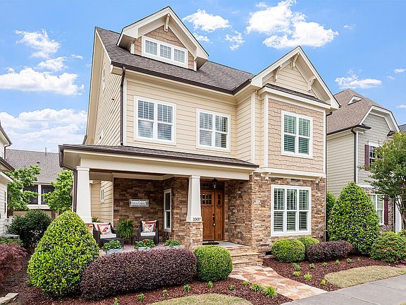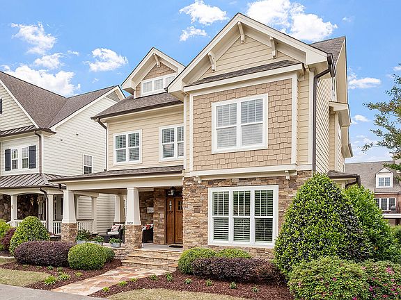 Back on the Market & Ready for you to Call Home! Gorgeous, Custom Village Square home featuring 4 beds & 4 baths! Enjoy open living spaces including large kitchen island with seating, breakfast room, cozy family room w/gas fireplace & built-ins, and 1st floor guest suite. 2nd floor boasts large primary suite with spa bath including glass block shower, 2 large secondary bedrooms with connecting ensuite bath, laundry room and large walk-in storage area. 3rd floor offers bonus and flex space as well as full bath. Home faces North with a screened porch and rear entry garage. Community has resort-like amenities including neighborhood dog park, pools, fitness center, & playgrounds that are all walkable! Close to 540/RTP, shopping, dining, & more!