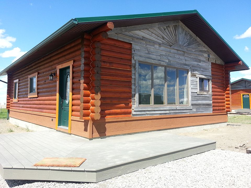Log, with some log visable inside. 9 ft ceilings, high end pine soft close kitchen cabinets and drawers. Master bedroom and bath. unique, quaint Excellent R efficiency rating. Quiet neighborhood, off street parking. Open lots between next home. Room to add on, build garage and room to roam!
