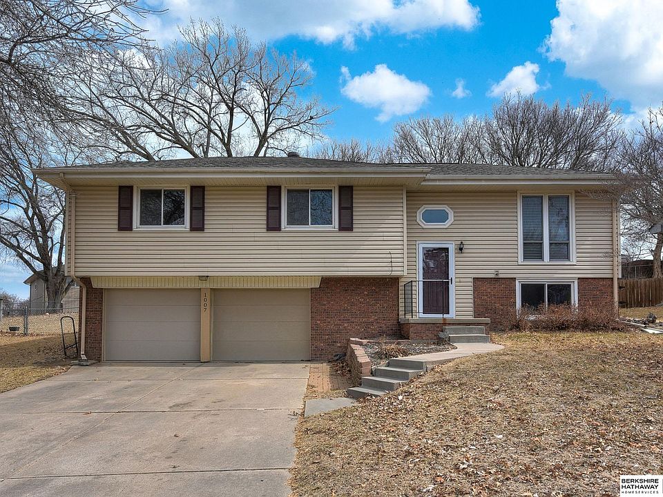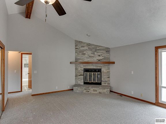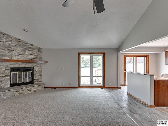 Beautiful home Papillion home close to parks and school. This home is sure to impress with the cathedral ceilings and ton of natural light flowing from the large windows and skylight. Kitchen has been completely updated with new expresso cabinets, tile flooring, granite countertops, stainless steel appliances and and island bar opening to the living room which features a stone fireplace. Separate dining area with tile floors and bay window. Three bedrooms on the main floor all with ceiling fans. Primary suite with walk in closet and 3/4 bath. Main floor full bath has updated tile, vanity and cathedral ceiling. New carpet throughout the main. Basement rec room leads to the oversized two car garage. Fully fenced back yard.
