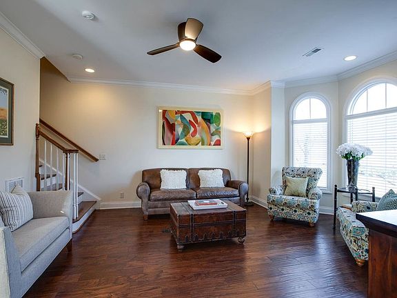 Light-Filled End-Unit Townhome! Beautiful distressed dark hardwoods, Large Eat-in Kitchen w/Granite & Stainless appliances,Gas Cooktop, Patio fence, small balcony off Master Bedroom, Walk in Closets, 2 Car Garage, **Walk to shops & dining!**