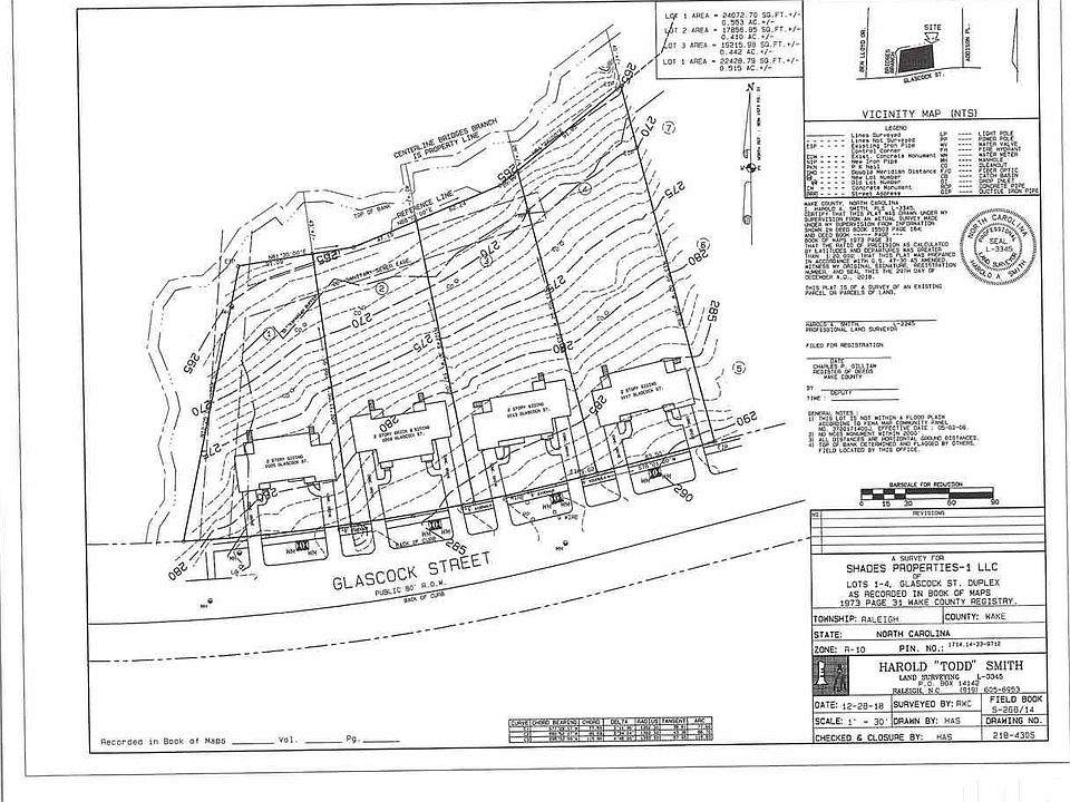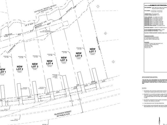 Coming Soon. 7 lot subdivision on Glascock Street. Currently 4 adjacent duplexes. Units are rented on a month to month basis. Subdividing into 7 lots for new single family construction. New home construction in the area is going for $600k-$700K. Hoping to have subdivision completed sometime in December. Hard to find this many adjacent lots in downtown Raleigh. $230,000 each. Lt 1 19,760 sqft Lt 2 9,824 sqft Lt 3 9,566 sqft Lt 4 10,059 sqft Lt 5 10,353 sqft Lt 6 11,279 sqft Lt 7 12,726 sqft