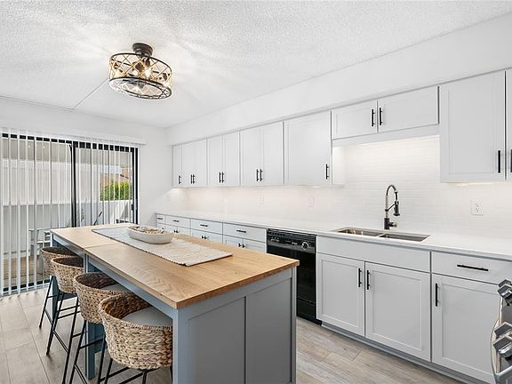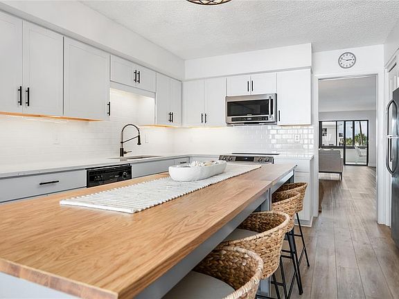 DIRECT BEACH VIEWS from this spacious, updated 2/2 unit in the Gulf-to-Bay complex of "Summer Sands". This beautiful, elevated unit had NO interior impact from the 2024 hurricanes. Updates include a NEW A/C installed 4/1/25, wood-appearance LVP flooring for durability and a time-less look, an updated kitchen with new cabinetry & stainless appliances, bathroom renovations, new, tasteful furniture & decor and a wine fridge added to the bar in the dining space. There is a spacious, enclosed lanai with access from both the living room & the primary bedroom. Watch the sunsets without having to leave your home! New grounds landscaping, pool updates & elevator replacement project were just completed. This great complex is located just across the street from the beach with spectacular views of the Gulf AND extends to the Intracoastal Waterway on the bay side to catch sunrises as well. "Summer Sands" offers a private, heated pool, jacuzzi & a scenic dock on the bay for residents & owners. Two, assigned car spaces and the elevator are conveniently located near this great END unit condo. "Summer Sands" owns the vacant, Gulf front parcel, which protects the unobstructed BEACH VIEWS of this fantastic complex. Looking for the best the Florida Gulf Coast has to offer? Here it is!