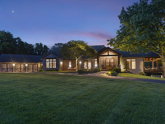 Experience refined elegance with rustic charm in this stunning 4-bedroom, 3.5-bath lodge-style home, offering over 3,600 +/- SF of thoughtfully designed living space. Set behind an iron security gate on a picturesque piece of 24 +/- acres of land, this property is a true sanctuary. Step inside the expansive great room, where a vaulted ceiling with massive rough-cut pine beams, wide plank wood floors, and a dramatic floor-to-ceiling rock fireplace create an unforgettable first impression. Walls of transom windows and doors flood the space with natural light and frame the beauty of the outdoors. The heart of the home is a gourmet kitchen featuring knotty pine custom cabinetry, quartz countertops, stainless steel appliances, a walk-in pantry, and seamless access to both a breakfast porch and a screened porch--perfect for morning coffee or evening relaxation. The main-level primary suite is a serene retreat with 10-foot ceilings, a cozy vented gas fireplace, a spa-like bath with jetted tub, walk-in tiled shower, dual-sink vanity, and a large walk-in closet with island and cedar-lined storage. A flexible office or fourth bedroom and a powder room complete the main floor. The English-style lower level (9' ceilings with full-size windows) offers two additional bedrooms, two full bathrooms, a cozy sitting area, storm shelter, and generous storage space. Outdoor living is unparalleled with four covered porches, an inground heated pool w/deck jets, an auto-cover, a pool house, flagstone patio with outdoor kitchen and fire pit--all designed for entertaining in style. Two stocked ponds, a whole-house generator, and a three-car attached garage add to the property's exceptional functionality. Every detail of this custom-built home has been crafted with care, offering a unique blend of lodge-style ambiance and modern luxury. Located only 20 minutes from Springfield. Additional acreage is available.
