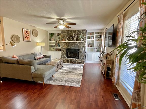 - Bookcases, Built-in Features, Fireplace, Bath in Primary Bedroom, Main Level Primary, Pull Down Attic Stairs, Quartz Counters, Tub Shower, Walk-In Closet(s), Window Treatments