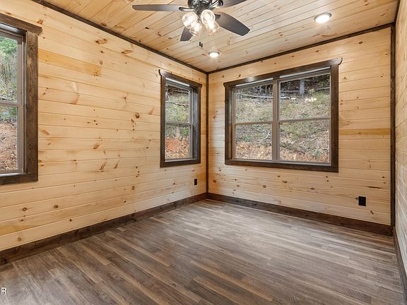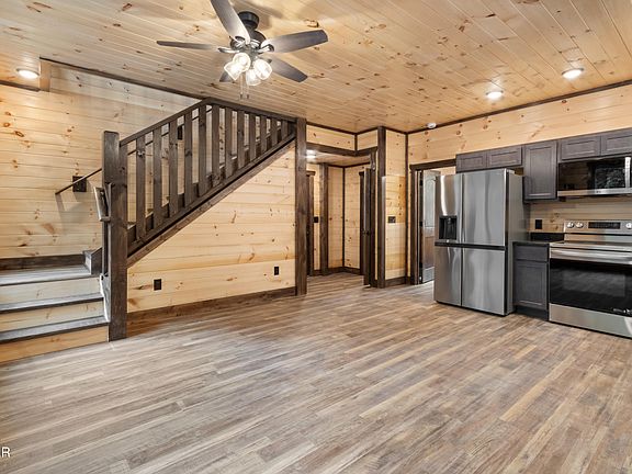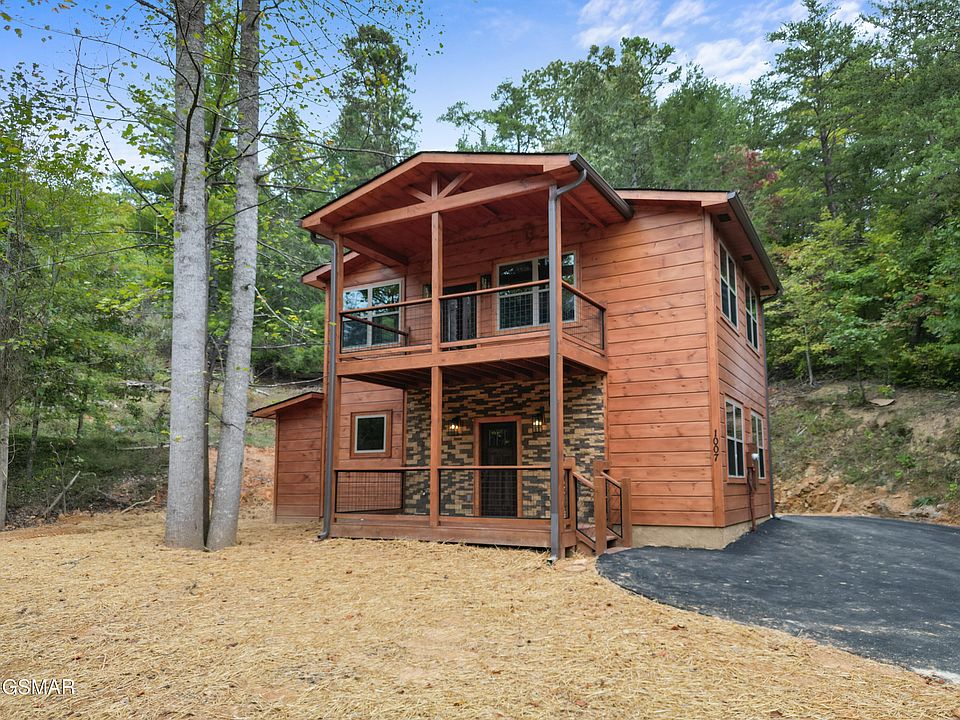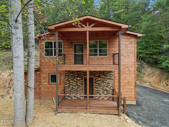 Only 15 minutes from the heart of Gatlinburg! Nestled on the side of a quaint mountain hill, this cozy one bedroom one and half bath cabin offers a serene escape from the hustle and bustle. The picturesque setting is complemented by a stunning exterior, featuring multi-colored stone and a sleek dark brown door, accented with modern black lighting. Unwind on the inviting front porch or enjoy the panoramic views from the second-floor balcony, perfect for sipping morning coffee or watching the sunset. On the first floor, you will discover light wooden walls with rich dark brown trim and stainless steel kitchen appliances. Upstairs, is home to a charming bonus room which boasts authentic barn wood from an old barn on the property, adding a touch of history and character. Experience the tranquility of nature in this idyllic cabin retreat. Furniture package coming soon so cabin will be furnished. Schedule a viewing today! Drone photography used.