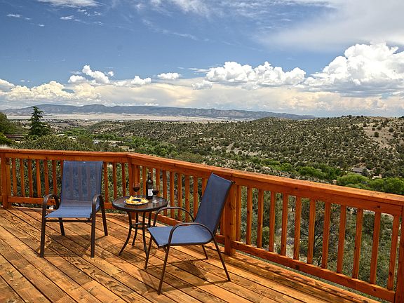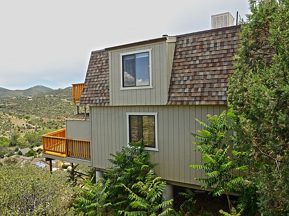 This two bedroom two bath home is located in a safe friendly neighborhood. There is one fireplace in the living room and a second romantic fireplace in the large master bedroom retreat. Both fireplaces have electric outlets above the wood mantels, great for romantic lighting, holiday lights and/or large screen television. This home is an escape from the ordinary. New gutters have been installed to provide a drip proof deck. The two patio doors off the living space have been replaced with new Dual pane glass and new sliding screen doors Inner doors are new solid wood knotty pine sound blocker doors. A private balcony is connected to the master bedroom with fantastic views, great place to enjoy a glass of wine in the evenings. A 1160' wrap around wood deck shows off fantastic views of mountains and thousands of stars at night. Set up your telescope and enjoy the show! Two patio doors open onto large deck entertaining area for relaxing outdoor living. The main deck is shaded for cool grilling nights. You have country living with city amenities Starbucks, Trader Joe's, Sprouts, Costco and more shopping plus movie theaters are only 10 minutes away. Upstairs bathroom has a shower and new Bosch stacker washer/dryer; clean clothes are just a step away. Downstairs bath has full bathtub. Hiking and biking paths are just down the street. There is a fenced in area for pets. Gentle rolling long lot, no one can build behind you and block the view. Under the house insulation has been blown in to a R21 factor making the house warm and cozy in the winter and keeping the house cooler in the summer months. An open space under the house for extra storage of outdoor equipment/ bikes or additional storage sheds is available. Refrigerator, stove and new Bosch Stacker Washer and Dryer are included with the house.