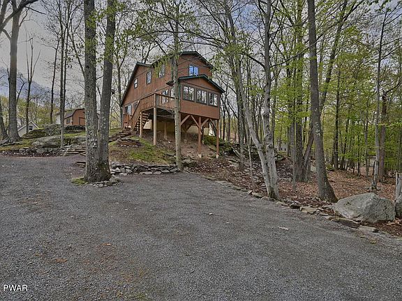 This freshly remodeled home offers seasonal LAKE VIEWS of LAKE WALLENPAUPACK. Located in Wallenpaupack Lake Estates, a four-season amenity-filled community in the Northern Poconos with lake rights. The home is right by the tennis and basketball courts on a quiet cul-de-sac, near wooded parcels for privacy. Beautifully updated house with an open floor plan, cathedral ceilings in the living area, inviting and light-filled sunroom with peaceful panoramic views and access to the deck, a brick fireplace, new flooring throughout the entire main level, new carpeting in the upstairs bedrooms, a private balcony, new bathrooms, laundry on the main level. The entire interior has just been painted. New kitchen counter tops and stainless-steel appliances for a modern yet cozy feel.