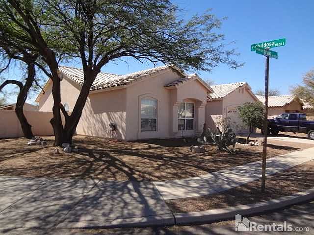 Spacious, Super Clean and Ready for YOU! Corner lot for extra privacy. Courtyard like entry to front door and traditional foyer entrance that opens to formal living room and dining room with rich wood floors. Dining room has wood window seat with storage. Spacious kitchen with oak cabinets, Stainless steel appliances including 5 burner gas stove and refrigerator. Breakfast bar open to large tiled family room and breakfast nook. Laundry room off garage directly into kitchen for convenience. Large master bedroom with bath that includes double sinks with built in vanity, garden tub, walk in shower and walk in closet. Good size bedrooms all with ceiling fans and large full bath. Park like backyard complete with full length patio, grass, rose bush and fruit tree. Fully fenced sparkling pool sure to keep you cool this summer! Hurry and call or text leasing 520-505-5664 or email: leasing@rpmrincon.com.
