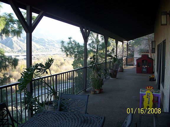 VIEW!VIEW!VIEW! This custom home in Shadow Hills has spectacular sweeping views of the San Gabriel Mountains off a large balcony. The home is located in a small gated community and is an entertainer's delight with high beam ceiling in the specious living room and a step down wet bar. Walk up two steps to the beautiful formal dining room. The kitchen has a huge island, tile floors, a built in trash compactor and other built in appliances. Off the kitchen is a separate laundry room. All three bedrooms are extremely spacious, with walk-in closet in the master bedroom. The large master bathroom has a step down Jacuzzi tub. The oversized two car garage has built in cabinets with a bonus room that can be used as a private office. There is a fabulous built in central vacuum and security system. New paint throughout the home as well as the exterior trim. Zoned for horses and RV parking next to the home. Must see to really appreciate all the amenities.
