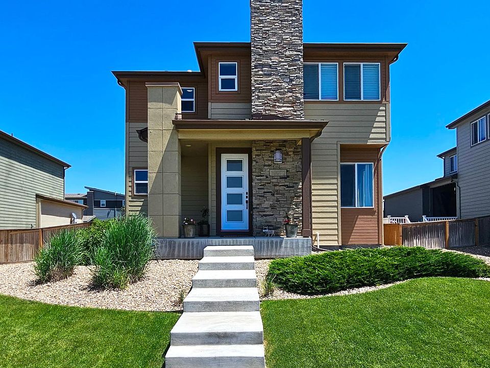 Located in the master planned Reunion Community. 13 minutes from Denver International Airport. 23 minutes from Downtown Denver. Amazing mountain views! Watch the sunset from the comfort of home. Plentiful light shines throughout this west facing property. Open concept, bright color scheme, plank flooring, updated black matte fixtures and modern touches throughout. Four (4) bedrooms, three and a half (3.5) bathrooms. Renovated kitchen with spacious island. New finished basement. One primary bedroom upstairs and another within the basement, both include double vanities and walk-in closets. Ceiling fans, softened water, storage, central A/C and heating. Attached two-car garage. New deck provides ample space to entertain. Rental includes passes to Southlawn Park Pool and Sports Court directly across the street. Passes also permit access to the Reunion Park Pool, Recreation Center and Coffee House a minute's walk away! Safe, family friendly neighborhood. Centrally located and walkable to local parks, lakes, trails, playgrounds and schools. Available furnished for an additional monthly fee. Dog friendly! No smoking. Background, credit and income verification required. Lease duration twelve (12) months at $3600/month. Security deposit required. Move in April 29th or later.