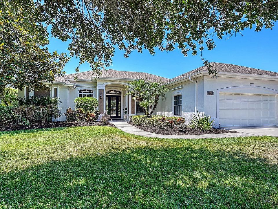 A private lakefront sanctuary set on nearly a half-acre, this four-bedroom plus den home in Lakewood Ranch's River Club gives a resort-like feel with a convenient location. The custom build from Oden Homes lives graciously with a thoughtful floorplan fit for families or retirees that features easy-care wood and tile floors, fresh interior paint, and room for effortless everyday living. A front office/den is ideally placed to allow for work-from-home privacy while living, dining, and family rooms are perfect for entertaining and feature views of preserve greenery. Enjoy cooking and conversing in the spacious kitchen with white cabinetry, stainless steel appliances, large pantry, and breakfast bar. An addition to the home includes a second den with gas fireplace, bedroom, and bath and adds further flexibility for multigenerational living. Updated and peaceful, the master suite with refreshed bath promotes the utmost in self-care, and the remaining bedrooms feel equally as luxurious with views of your picturesque surroundings. A paver pool lanai with spa takes full advantage of the private lot, with a stone finish to the pool for added tropical aesthetic that perfectly complements the lush views. A two and one-half car garage with storage and newer A/C system complete the home. River Club is a deeded golf course community with excellent schools and is close to the interstate, beaches, and downtown. Enjoy all Lakewood Ranch amenities without the CDD fees and low HOA fees.
