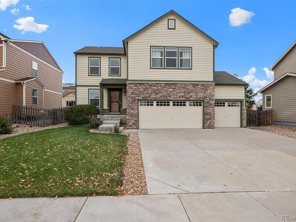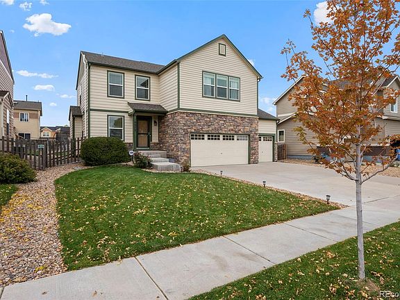 Move in ready! All appliances included, window coverings, doorbell camera, myQ LiftMaster garage door openers, landscaped yard, sprinkler system front & back, fenced back yard, ceiling fans. Spacious feel with vaulted ceilings, an open floor plan & a loft. This home is a former model home, it has updated features such as 4 built-in radio/audio surround sound systems, drywall finished 3 car attached garage, it is a premium lot, located across from the community park & open space, with extra street parking. This 3 bedroom, 2.5 bath home features a loft, a full-size laundry room upstairs, 3 spacious bedrooms, 2 full sized bathrooms with dual sinks, walk in closet in primary bedroom, gas fireplace in living room, built-in custom cabinets, custom shelves & an open floor plan on main level, with a nice foyer area upon entrance, wooden blinds, & central air conditioning. There is an open unfinished basement that has 2 Egress windows, a radon mitigation system & a sump pump, it also has plumbing stubbed for future development. Location is desirable near Reunion Area, Denver International Airport, & not far from the Aurora Medical Campus. East/West facing direction of home allows plenty of natural sunlight.