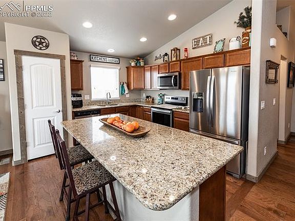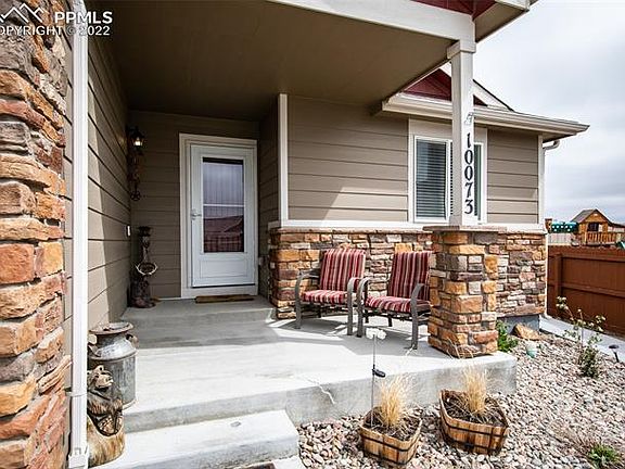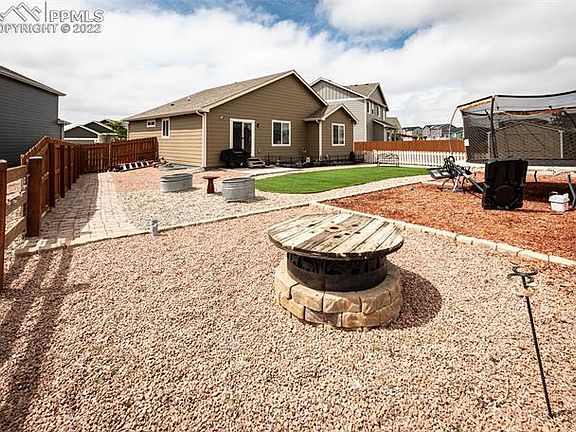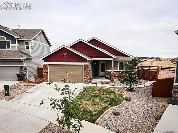 Why wait to build a new home? Move in to this immaculate rancher in Meridian Ranch today! Sit back and relax on your covered porch entry or have some fun in the sun on your custom landscaped backyard with firepit and dog run. Step inside and you'll see all the fantastic finishes... Newly upgraded wood laminate flooring on the main level. Open kitchen boasts a large center island, granite counter tops, stainless steel appliances, vaulted ceiling, pantry, a new refrigerator, recessed lighting and open to the dining area. Walk out to a concrete patio and enjoy the privacy of open space behind your home. Master suite has an adjoining 5-pc bath with dual sinks, a large tub and a walk in closet. Second main level bedroom (currently being used as an office) and full bathroom with tile surround. Downstairs you will find an enormous family room, two spacious bedrooms with walk in closets, a third full bathroom with tile surround and an added storage room with sump pump. Wired for security. Chicken-wired fence. Original owners in 2018, The Lowell model of Saint Aubyn Homes offers comfort and is great for entertaining/hosting family and friends. Close proximity to neighborhood parks, Meridian Ranch recreation center featuring two pools (indoor & outdoor) and the 18-hole Antler Creek Golf Course. Within 30 minutes to Schriever AFB, Peterson AFB, Fort Carson and Air Force Academy. Welcome Home!
