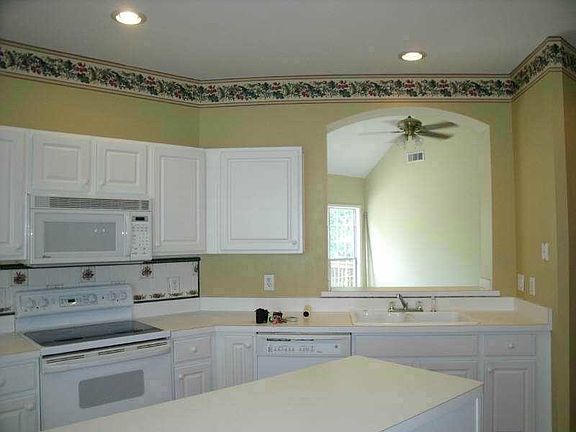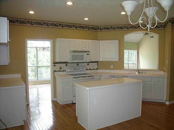 • Kitchen Features: Cabinets White, Island, Breakfast Area, Counter Top - Laminated, View To Fmly Rm, Country Kitchen
