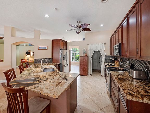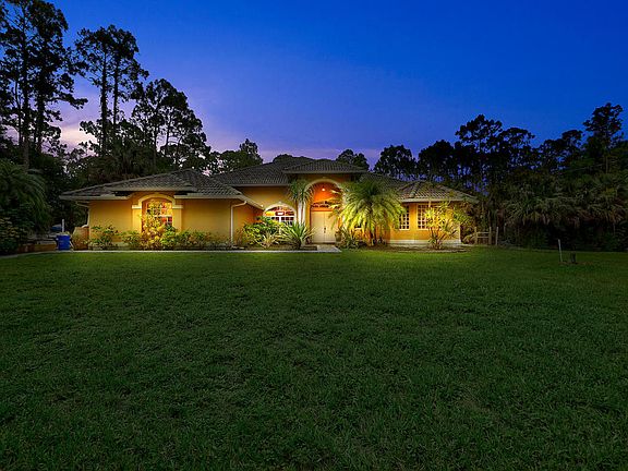 Highly sought after Jupiter Farms home! 2.67 acre property! 4 bedrooms, 3 bath, plus den, cbs home with huge pool/screened patio area! Formal living and dining room, family room adjacent to remodeled kitchen, stainless steel appliances, granite counters, very versatile floor plan with separate bed and bath with wet bar/kitchenette private entrance that could be mother in law or guest quarters, elegant master bedroom/bath suite, tile throughout, fantastic outdoor living space with covered patio overlooking gorgeous backyard and oversized pool/spa. Great location on paved road, fully fenced, private lot, beautifully treed, multiple cleared trails, mango and avocado trees, plenty of space for stables, large parking pads for boats or trailers, zip line, fire pit area. This one is a must see!