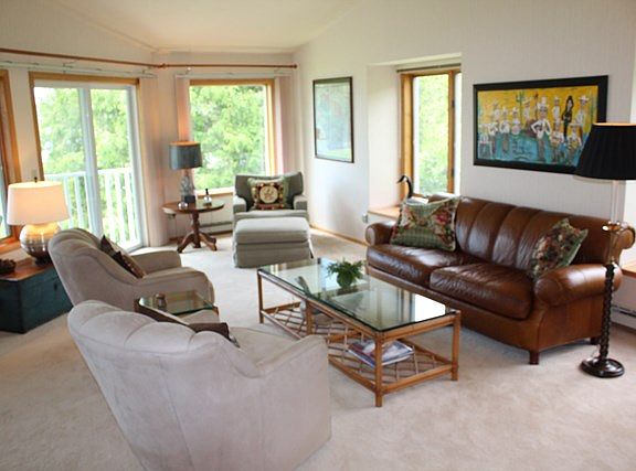 Sought after and spacious, with beautiful views of Eagle Harbor and the Ephraim Yacht Club marina, this bright and sunny three bedroom, two bath second floor unit features windows on all four sides The wonderful open floor plan in the living/dining room features vaulted ceilings, bay windows with bench seats, a gorgeous fieldstone fireplace. Sliding doors open to the deck, offering great opportunities for outdoor entertaining. The Master suite has a spacious walk in closet and newly updated ensuite bath with huge stand up shower. The two additional bedrooms also have ample closet space. There is a lovely pool area and private sand beach and pier. All this is just steps to shops, restaurants and the shoreline of historic Ephraim village.