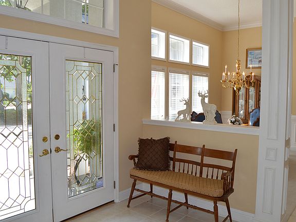 This beautiful home is bright and airy and welcomes you with soaring 12 ft. ceilings. The interior is tastefully appointed with crown molding throughout, multi-step tray ceiling, graceful archways, stainless steel appliances, 2-sided fireplace and custom built-ins. A spacious master suite boasts a spa-like master bath with garden tub and newer tiled walk-in shower with two shower heads and bench. Enjoy tranquil wooded views from family room, office/study or the comfort of the spacious screened lanai. Call for your private showing. Club membership for homeowners includes clubhouse with pool, exercise, tennis, golf, dining, activities.