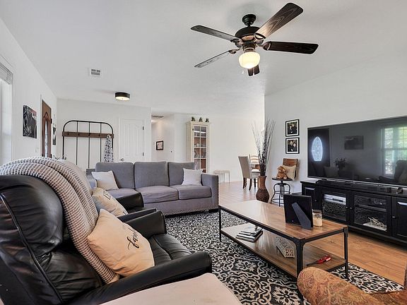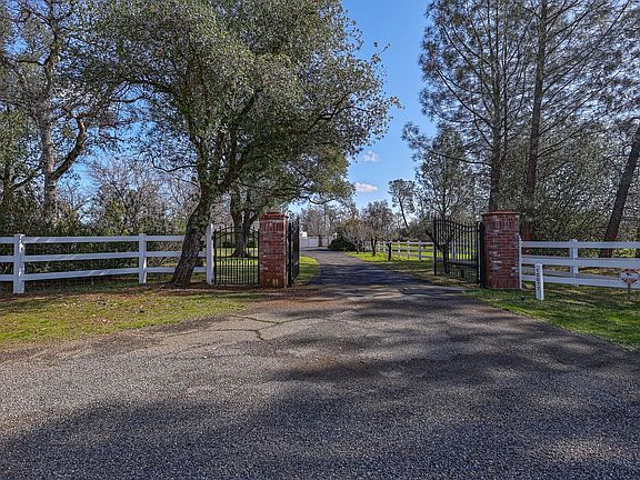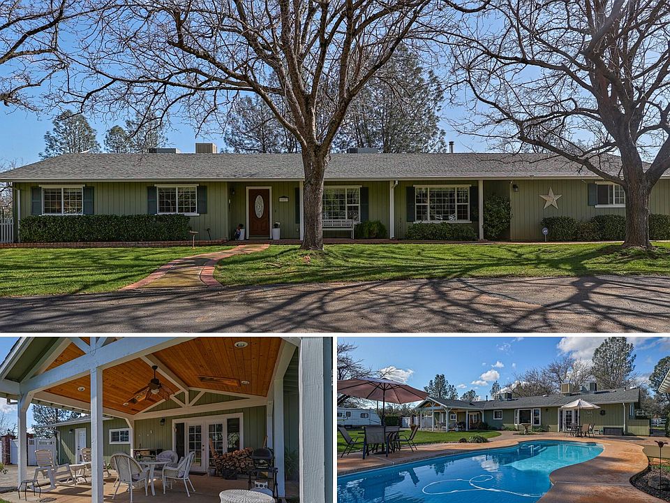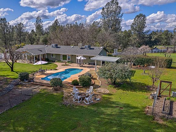 Discover your private oasis on 5 acres of parklike tranquility, boasting a beautiful ranch-style home with OWNED SOLAR and a sparkling SALTWATER POOL. Nestled beyond a gated entrance and paved circular drive, this 3-bed, 2.5-bath residence offers a welcoming covered porch, open floor plan, and custom finishes. Enjoy separate living and family rooms, a cozy wood-burning stove, and ample natural light from large view windows. Step outside to a covered patio overlooking a landscaped backyard paradise, complete with multiple entertainment areas near the pool, firepit, and mature shade trees. Additional highlights include a fenced garden, fruit trees, and a chicken coop with run and storage shed all within fenced and cross-fenced grounds.