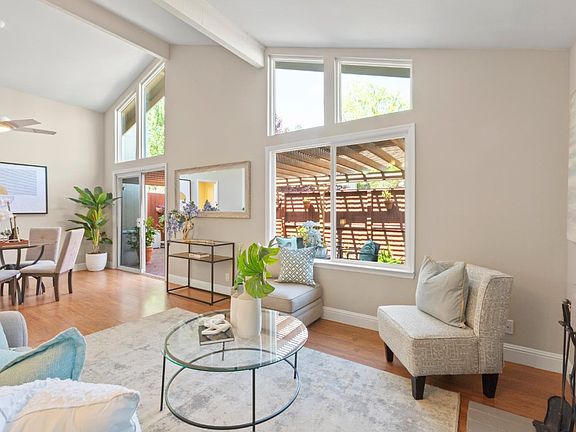 The essence of single family-like elegance with this luxurious 2-bedroom townhome, nestled in the prestigious gated neighborhood of De Anza Oaks, Cupertino. Only ONE level and ONE shared wall. The best in school academics with Monta Vista High! OPEN & AIRY floorplan w/ soaring vaulted ceilings. This exquisitely remodeled kitchen serves multiple purposes, showcasing elegant white shaker cabinets, sleek granite countertops, an integrated desk, a cozy eat-in nook, and a spacious pantry closet. Discover the expansive primary bedroom, complete with vaulted ceilings, ample closet storage, & an en-suite bath. Numerous custom upgrades include dual pane windows, sun tunnels, wood like plank floors and designer carpeting in the bedrooms. Interior laundry room accommodates full size, side-by-side washer & dryer. Attached 2 car garage & big driveway! Garage wall to wall enclosed storage shelving units. Relax in the tranquil backyard oasis, adorned with blooming flowers and lush greenery, featuring Trex decking and a covered pergola overhead. LOW HOA w/ resort amenities: Huge Park, Playground, 2 Pools, Big Clubhouse, Trails... all secured behind gates. Enjoy the beauty of the foothills with Silicon Valley at your fingertips! Whole Foods, Memorial Park, De Anza College! Welcome Home!