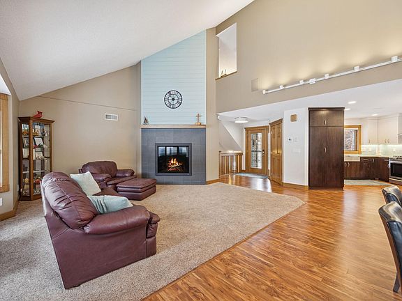 This Executive home in the Sartell School District boasts a beautifully landscaped yard with mature trees.