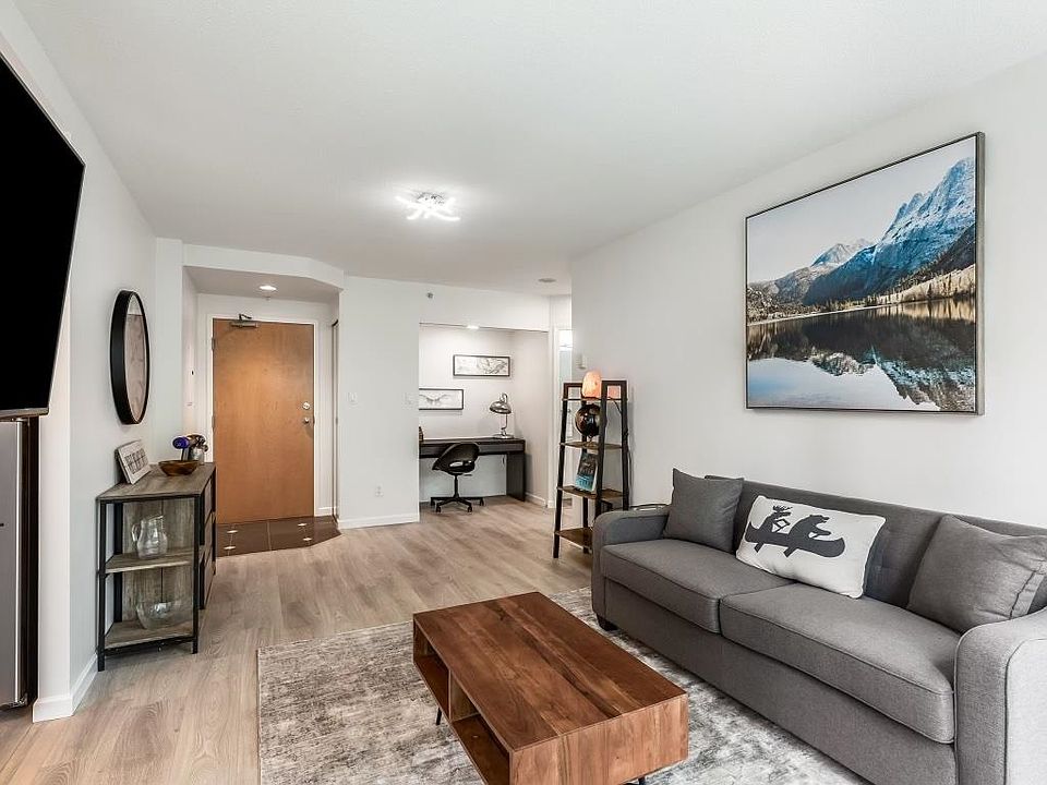 Welcome to this spacious and bright 1-bedroom, 1-bathroom, and den at Orca Place in Coal Harbour, featuring modern updates such as laminate flooring, quartz countertops, stainless steel kitchen appliances, new bathroom tiles, and a fresh coat of paint. Enjoy access to amenities including a gym, hot tub, meeting room, and daily on-site management. Located mere moments away from Robson Street, the Seawall, Shoppers Drug Mart, Starbucks, Urban Fare, and a plethora of dining options including Tableau restaurant at the Loden Hotel and soon-to-open Nook across the street. This unit comes with 1 parking space and 1 storage locker. Don't miss out on experiencing it firsthand!