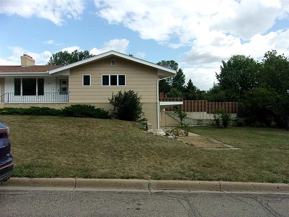 NEW PRICE..JUST REDUCED!! ALL NEEDS ARE MET ON ONE FLOOR! This unique home, designed by ND born top LA architect, is adorned with an inviting large brick front porch and nestled on the hillside with a view! NO FLOOD ISSUES HERE! Exterior and interior has been freshly painted and professionally cleaned--simply move-in-ready! So many extra features -hard to list all. Upon entering you are greeted with an entry coat room, a spacious living room with a lovely stone (from SD) fireplace-note the fossils within the stones, a formal dining room, eat-in dining area with custom built-in buffet and patio door leading to a patio, a large kitchen with custom cabinets galore, a mudroom/laundry room, main full bath, 2 ample size bedrooms (one has a sliding glass door leading to a roomy deck) and a master suite with 3/4 bath. Doorways and hallway are extra wide and 1 wall in hall is all closets. The walk-out lower level features a massive family/entertainment room with wet bar and custom built cabinets on one entire wall, 3/4 bath (with window), carpeted room (used for guest room-no window), plus 2 additional large rooms (for tons of storage or can serve many other purposes). There are 2 furnaces, a water purification system and laundry hookups. The family room area has a sliding glass door leading to yet another patio and a great size (flat) yard with hand-built stone wall (from family farm), mature trees, shed and real redwood newly stained redwood fence.