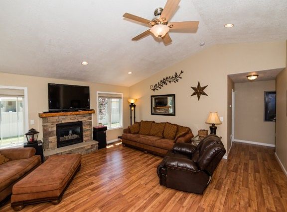 BEAUTIFUL NEWER HOME WITH AN OPEN KITCHEN, DINING ROOM AND LIVING ROOM WITH A GAS FIREPLACE. GARDEN JET TUB IN MASTER BATH, AND WALK IN CLOSETS IN 3 BEDROOMS. A FINISHED 3 STALL GARAGE WIRED FOR SURROUND-SOUND, CABLE AND 220V. A FAMILY ROOM IN THE BASEMENT WITH SURROUND-SOUND AND A 54'' TV. A CONCRETE RV PAD, 6' PRIVACY FENCE, MAINTENANCE FREE COVERED PATIO WITH 220V FOR HOTTUB.