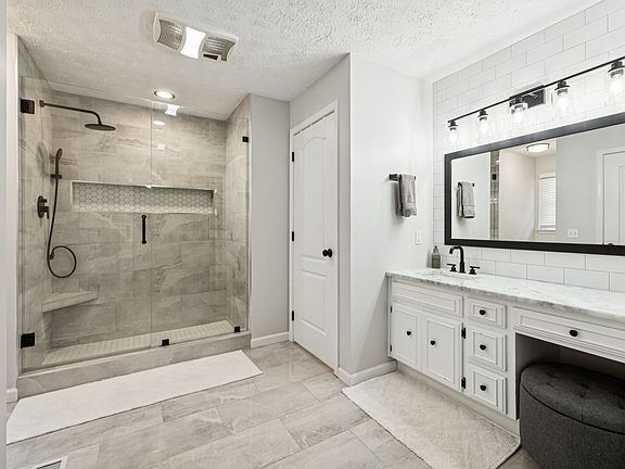 Beautifully renovated one-level home nestled in a quiet cul-de-sac. The kitchen showcases granite countertops, a classic subway tile backsplash, and elegant white cabinetry, opening to a dedicated dining area. The living room offers abundant natural light and a charming fireplace, creating a warm and inviting space. The spacious primary suite features barn-style sliding doors, while both bathrooms have been thoughtfully updated with walk-in tiled showers, tile flooring, and built-in closets. An encapsulated crawlspace adds to the home’s comfort and efficiency.