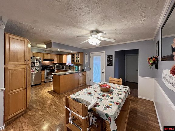 Beautifully updated 4 bed, 2 full bath, 2 half bath home right in the heart of Mountain Home. Large back deck with hot tub overlooking the nice fenced in back yard. Two primary bedrooms, one featuring a jacuzzi tub and tile walk-in shower. Kitchen has granite countertops and stainless steel appliances. Downstairs has second family room, a half bath and a safe room.