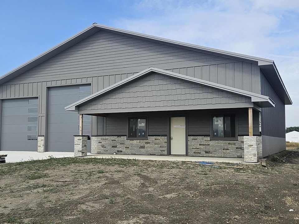 Versatile shop-house shell in Webster's new Western Sunset Addition. This 60' x 56' structure features upgraded exterior finishes, vaulted trusses, covered front porch, and a drive-thru garage with rear alley access. Includes walk doors, windows, and 3 overhead doors (two 12', one 14'). Utilities stubbed to building; curb, gutter, paved streets, concrete drive & walk complete. Situated on an 85' x 170' lot with trees and grass. Zoned residential/light commercial. Interior is unfinished—customize as lodging, business, or shop-house.