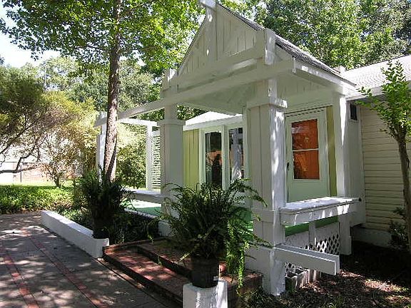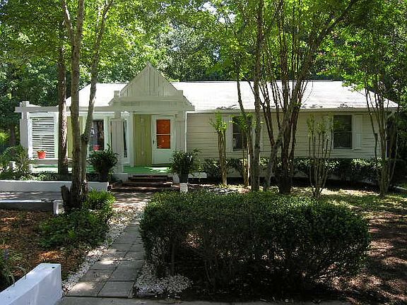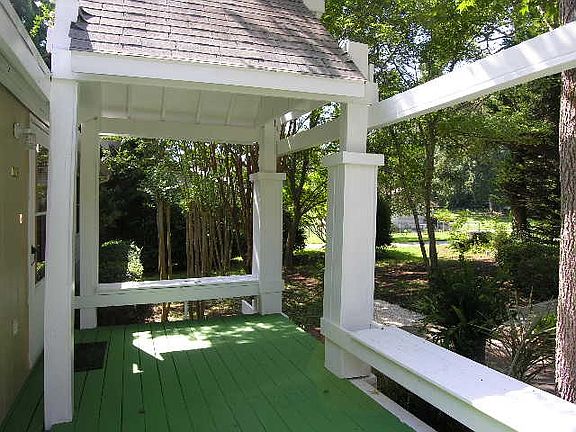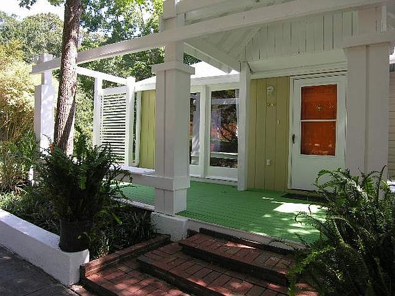 This unique one level home tucked at the end of a cul de sac has the charming look of a Caribbean get away with architecturally designed front entrance porch and custom seating. Front living area is spacious with abundant built in bookshelves and new carpeting and sun room off back leads to nice deck overlooking very private back yard. Both baths have been refreshed including new flooring. Kitchen has updated flooring as well. Property is partially fenced and has a detached but convenient 2 car carport. HVAC replaced in 2012 and newer DW and washing machine. There is an 8x8 concrete storage area under the house. Taxes reflect NON-owner occupied status.
