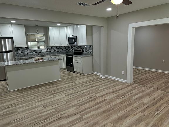 Welcome to Listen to the Blues Fly, a charming 4-bedroom, 2-bathroom house located in the beautiful city of Pensacola, FL. As you step inside, you'll be greeted by an open floor plan, perfect for entertaining guest or spending quality time with loved ones. The kitchen boast elegant granite countertops with convenient soft-close drawers and a 7 ft island which provides a sleek and modern touch to the space for a touch of sophistication to your culinary endeavors. imagine preparing delicious means while enjoying the company of family and friends. Carry your evening to the back portion of the home, you can enjoy the large entertainment room with electric fireplace which displays various lighting features and adjustable temperatures. This delightful home offers a fenced backyard, perfect for outdoor activities, ensuring privacy and offers a safe and secure area for children or pets to play freely, while the covered patio provides a cozy spot to relax and unwind after a long day which can be accessed from the kitchen or the entertainment room. Two large storage sheds in the backyard would be great for items to store or could be a playhouse for the kids. This home is situated in close proximity to the stunning Pensacola Beach and Perdido Key Beach, you'll have endless opportunities to soak up the sun, enjoy water sports, or simply relax by the shore. For those seeking adventure, the nearby NAS and the renowned Blue Angels provide thrilling experiences. With its prime location and desirable amenities, Listen to the Blues Fly is the ideal place to call home. Don't miss out on this incredible opportunity to experience the best of Pensacola living. Contact us today to schedule a viewing!