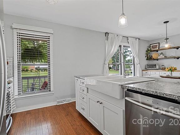 Welcome home to this beautifully maintained and updated ranch in the Country Place neighborhood. The home features a rocking chair front porch, engineered hardwoods throughout the home, and a large extended two-car garage with additional office space and workshop spaces. The kitchen features white cabinets, granite countertops, a farmhouse sink, subway tile, and stainless appliances. The great room features vaulted ceilings and access to the back deck. The yard is fenced and features a large wood deck with an on-grade stone fire pit area and a pergola with a twin sized swing bed for ultimate relaxation and enjoyment! This home is located just minutes from historic downtown Matthews, NC which features a wide variety of shops and restaurants, as well as entertainment events!