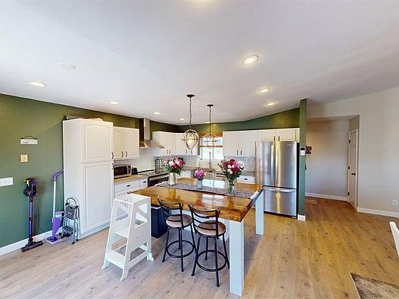 Nestled on an extra-large corner lot, this inviting home features an open-concept kitchen with vaulted ceilings and a two-sided gas fireplace that adds warmth and ambiance to both the dining and living areas. The kitchen showcases a generous butcher block island with built-in storage and durable cement countertops—perfect for both everyday use and entertaining. Step down into the expansive living room, where a striking rock fireplace wall adds character and a cozy focal point. The home offers three comfortably sized bedrooms, including a primary suite with a beautifully remodeled bathroom completed in 2022. That same year, the home was updated with fresh paint and all-new flooring throughout. Outdoors, you'll enjoy a fully landscaped front yard with a sprinkler system and a private backyard enclosed by a wood privacy fence. French doors off the kitchen lead to a concrete patio shaded by a pergola—ideal for outdoor dining or simply relaxing. The backyard also features a versatile he/she shed, perfect for hobbies, a workout space, or a peaceful retreat, plus an additional shed for storage. A large gate at the back of the property provides convenient access for RV or additional vehicle parking. This home is move-in ready and full of charm—don’t miss your chance to see it. Schedule your private tour today!