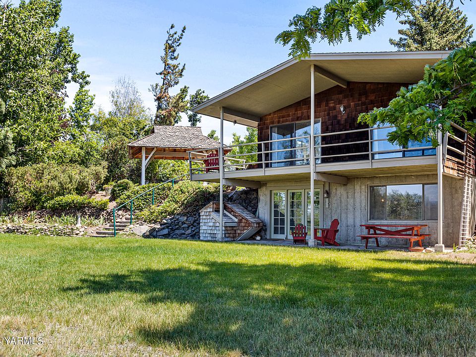 A dreamy, almost hidden home with a beautiful view awaits you on Crest Acres Place in Yakima WA. Built in 1968, this 1 owner home is experiencing its first time on the market. The new owner will be getting a real gem! Enter the property through a portico and there take in the view of the canyon to the west and the tip top of Mt Rainier from under the original Belvedere. Steps lead down to a grass yard, terraced flower beds and beyond that is the second plot which has previously featured a large garden. Back up and inside this home you will find a living space with original hardwood floors, a brick wood burning fireplace, two large windows/sliding doors that open onto a wrapping porch. The views are just as dramatic here! The dining and kitchen are open and allow for a dining table that could fit 10. You will also find three bedrooms, the primary one includes a bathroom and the main bathroom which is large enough for a busy morning filled with people needing the mirror and counter space. Down in the daylight basement you will encounter a spacious laundry room, huge storage room and shop area. Next is a living space with a wet bar and full bathroom. The second wood burning fireplace you will notice in the lower level one has never had a fire inside it. Its very quaint and charming as the design of the lower level was inspired by homes found in Colonial Williamsburg VA. Plenty of life in the roof, furnace and other systems and you will see the wood in this home looks practically new. A detached two car garage completes the property. This home and the surrounding lot has been loved and maintained by one family since 1968, maybe you will be the next carer of 1008 Crest Acres Place. Call for a showing today!