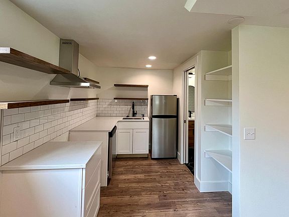 Stunning, newly constructed 1 bedroom apartment with private side yard boasting charm, sophistication and convenience in a residential neighborhood. Step into a beautiful, bright open concept living/dining area adorned with wood-like flooring that leads to a stunning all white kitchen including brand new appliances (dishwasher, fridge, stove). It boasts quartz counter tops, subway tile backsplash, shaker cabinets and open shelving ready for prepping your favorite meals. Just off the main room is a beautiful bathroom including a subway-tiled showered, chic vanity and mirror, and black hexagon tiled floors. The bedroom is spacious and filled with natural light. It includes its own brand new stackable washer and dryer and plenty of closet space.