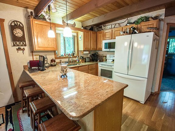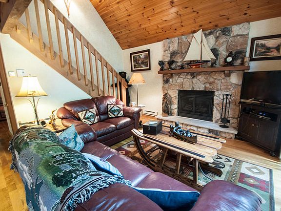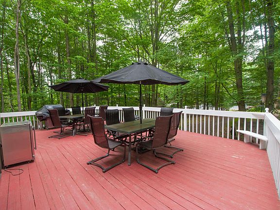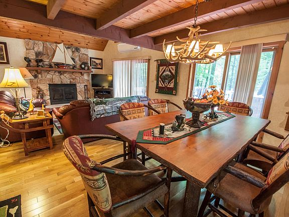 IMMACULATE & PRIVATE, 4 Bedroom, 2 Bath chalet in the amenity filled Wallenpaupack Lake Estates community! This home, adjoining a Wallenpaupack Lake Estates greenbelt and set on a cul-de-sac, is made for entertaining w/a large wrap-around deck and plenty of room for guests. This mountain retreat includes T&G ceilings, hardwood floors, a stone fireplace, a master suite, loft & oversized garage! WLE has central water & sewer AND the furniture is INCLUDED!