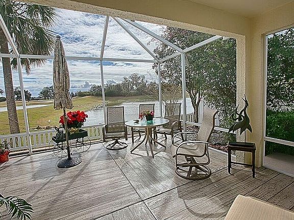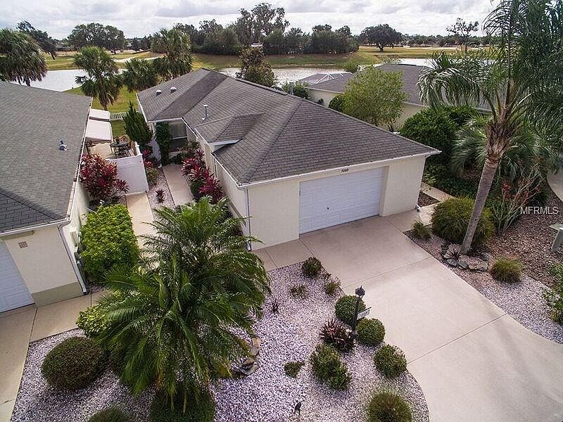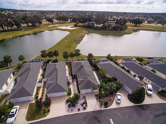 VIRGINIA TRACE...ACROSS THE STREET FROM LAKE SUMTER LANDING! LOCATION, LOCATION. LOCATION! LITERALLY...Just over a half mile walk, jog or ride to Lake Sumter Landing from this amazing concrete and stucco GOLF AND MULTIPLE WATER FRONT courtyard villa that has been decorated and upgraded perfectly. HUGE 27 FOOT DEEP BY 23 FOOT WIDE OVER 590 SQ FOOT 2 CAR WIDTH FRONT LOAD GARAGE---VERY RARE FOR A COURTYARD VILLA!!! Not only is this the perfect location it comes with AMAZING GOLF AND 2 DIFFERENT WATER VIEWS. The home has been finished off perfectly with porcelain tile throughout except bedrooms. The covered lanai and ADDED BIRDCAGE has been floored with beautiful stamped concrete...The landscaping is almost maintenance free with no grass to mow. The home has vaulted ceilings, Maple toffee cabinets, a gorgeous lead glass front door with a tropical Florida bird and an alarm system that is owned and can be monitored. The home can be purchased with a TURNKEY PACKAGE separately. An additional fridge, large storage cabinets and shelving is included in the garage. The driveway, garage floor and walkways have also been finished with decorative painting. Open up your front sliding retractable screen door and the back sliding glass doors to the amazing views and let the breezes flow through! bond balance $7,019.