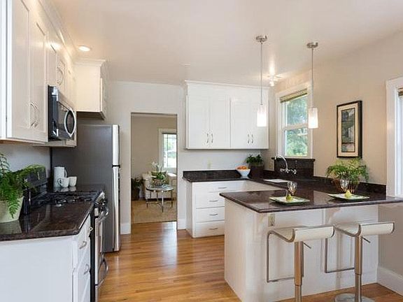 Open plan kitchen and dining room. Kitchen has new gas stove, fridge, dishwasher and microwave.