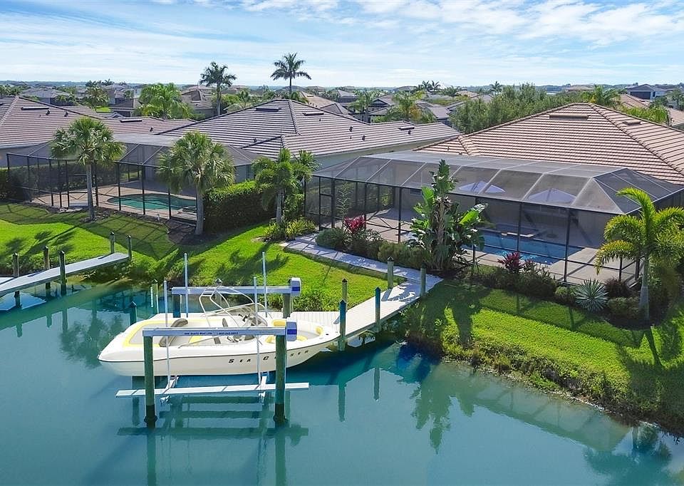 One or more photo(s) has been virtually staged. Welcome home to boater's paradise at Tidewater Preserve! This exquisite four-bedroom, three-bath pool home with a three-car garage offers a blend of elegance and functionality. As you step inside, you're greeted by an open floor plan with tray ceilings and plantation shutters, creating an inviting and spacious atmosphere. The recently refreshed kitchen is a chef's dream, featuring lighter cabinetry, a new island/breakfast bar, stainless steel appliances, quartz countertops and a natural gas range. It's the ideal space for preparing meals and entertaining guests. The outdoor oasis is equally impressive, boasting a new Custom Ozone self-cleaning pool and spa, as well as a spacious extended lanai and cage with travertine pavers. Step outside to enjoy your private dock with a 10,000-pound lift, ideal for keeping your boat steps away, providing access to the Manatee River for endless boating adventures. Every detail has been thoughtfully considered, from the hurricane-impact glass on all doors and windows to a tankless water heater, a smart home thermostat, security cameras, and automatic hurricane storm protection on the patio. Plus, the entire home has been freshly painted for a beautiful aesthetic upgrade. Tidewater Preserve elevates luxury living with a private marina granting access to the Manatee River, two clubhouses including The Lodge with resort-style pools, a fully equipped fitness center, and a community room with catering kitchen, billiards, flat-screen TVs and indoor/outdoor gas fireplaces. Outdoor enthusiasts will love the three Har-Tru tennis courts, nature trails, and the canoe/kayak park. Security is paramount with a 24/7 staffed gatehouse and meticulous lawn and landscape maintenance covered by association fees, which also include Wi-Fi, internet, and cable services. Experience a perpetual vacation at Tidewater Preserve, where every day feels like a getaway.