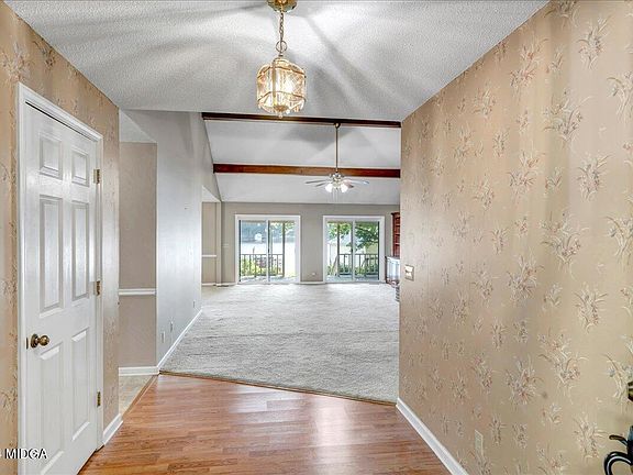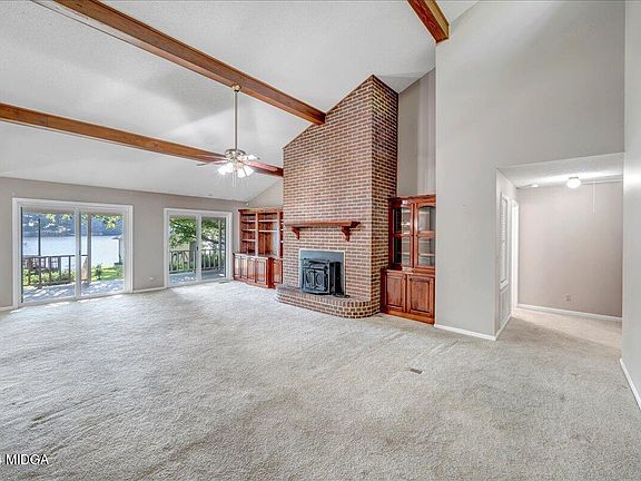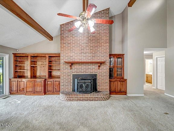 • Features: Beamed Ceilings, High Ceilings, Vaulted Ceiling(s), Bookcases, Ceiling Fan(s), Entrance Foyer, Carpet