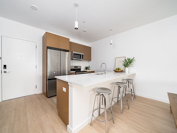 This is a top floor, 752 square foot 1 bedroom, 1 bathroom apartment featuring a bit closet in the bedroom and an office nook! Natural sunlight shines in from the east through the picture windows in the morning and you get views of the surrounding area around the clock from your living room and bedroom. Reach out for a virtual tour and to set an in-person appointment. Welcome to The Station at Netherwood! An offering of 42 meticulously designed one and two-bedroom apartments that redefine contemporary living with features like stainless steel GE appliances, in-unit laundry and elegant finishes throughout. Revel in the stylish details such as walnut-style cabinets, white Caesarstone countertops, pendant lighting, and white oak luxury vinyl plank flooring. The on-trend bathrooms boast white penny tile floors, stand-up and/or tub showers, and stylish vanities. Each unit comes with its own water heater and in-unit stackable washer/dryer for ultimate convenience. Beyond your front door, indulge in exclusive building amenities like the rooftop resident's lounge and the second floor gym.. Take in panoramic views from the 1400 square foot rooftop and prepare to make The Station at Netherwood your next apartment stop.