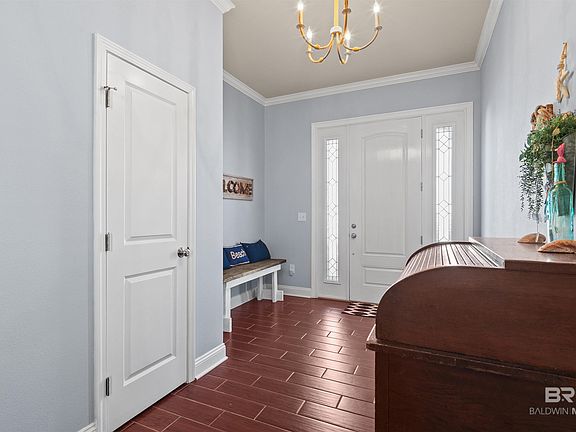 Stunning home located in Cottages on the Greene. This beautiful gold-fortified residence is conveniently situated near the community entrance, offering both privacy and ease of access. Its charming front porch (6x11) provides an ideal space to enjoy your mornings while overlooking the common area. Built in 2016, this home boasts 2,422 square feet of thoughtfully designed living space. It is a two-story property featuring four bedrooms and 3.5 bathrooms. The unique open floor plan welcomes you with a spacious foyer adorned with 17-foot cathedral ceilings, creating an inviting and grand entrance. All window treatments and appliances are included, along with beautiful granite countertops in the kitchen. The home features distinctive lighting fixtures that add a special touch, and ample storage is available throughout the residence. On the main floor, you'll find the primary bedroom and bath, plus an extra seating area perfect for relaxing or entertaining. The private front porch is an ideal spot to share a morning coffee. Additional highlights include ceramic tile accents along the staircase, ceramic flooring throughout the home that enhances coziness, and a recent exterior paint job, ensuring the residence is in mint condition. The main floor also includes two bedrooms and a bathroom, along with convenient laundry room off the kitchen. Upstairs, a gorgeous pine stairwell leads to a spacious area that can serve as a playroom, or additional lounging space, along with another bedroom that provides extra room. Cottages on the Greene offers residents access to a range of amenities, including a pool, clubhouse, fitness center, and scenic sidewalks perfect for walking or bicycling. The location is also conveniently close to restaurants, schools, OWA, shopping centers, beaches, and the Foley Beach Express. Buyer to verify all information during due diligence.