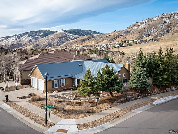 GORGEOUS CUSTOM RANCH WITH MAIN-FLOOR PRIMARY SUITE IN COVETED NORTH FORTY! Over $185K in recent improvements. Nestled on corner lot in quiet cul-de-sac. Spectacular foothills views from back yard and garden-level basement. Front porch views of North Table Mountain. Light-filled, open floor plan with Santa Fe-style architecture and high-end finishes. Exposed beams, vaulted ceilings, skylights, and Alder wood throughout. Entertainer’s dream kitchen with new stainless steel appliances, eat-at bar, and walk-in pantry. Kitchen opens to dining room and great room with cozy Kiva gas fireplace. Newer, custom sliding door opens from dining area to large, covered patio - ideal for indoor and outdoor entertaining. Generous main-floor primary suite has five-piece bath and includes jetted tub, new shower enclosure, and two walk-in closets. Two additional beds, full bathroom, powder bathroom, and updated laundry with newer washer and dryer also on main level. Finished basement has media/family room, two guest bedrooms, and updated full bath (a basement bedroom is currently used for home fitness and includes infrared sauna!). Basement media/family room has brand new 85” TV with Sonos Playbar. Backyard sanctuary with new pressed concrete patio, raised bar seating area, and newer hot tub - all perfect for outdoor parties and enjoying the VIEWS! Extensive professional landscaping in front and back yards. Newer French drains, new drip lines, perennials throughout. Newer cedar privacy fence with two custom gates. Oversized two-car garage has brand new 220, EV outlet, and garage floor. Brand new furnace, A/C, and dual water heaters. Added enterprise-grade Luxul WiFi network throughout. Enjoy the Golden lifestyle with trailheads to downtown Golden & North Table Mountain just out your front door! Lookout Mountain, Golden Gate Canyon State Park, School of Mines, plus popular shopping & dining are minutes away. Easy access to downtown Denver, and mountains. No HOA fees. Welcome Home!
