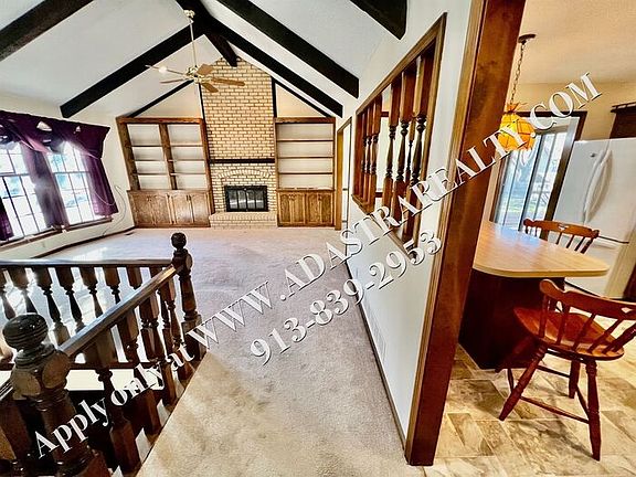 This spacious three bedroom, two and a half bath home has so much to offer! Open and spacious main living space has fireplace, vaulted ceiling, ceiling fan, built in shelves, natural wood beams and new carpet! Kitchen has plenty of counter space as well as wood cabinets! Patio door off dining gives access to large deck and spacious yard! Lower level has second living space complete with second fireplace, room for an office or non-conforming bedroom complete with built in glass cases and it's own 1/2 bath! Laundry and access to large two car garage with ample work space are also on the lower level. Back yard is also accessible from walk door in garage. Close to highways, shopping, dining and everything Olathe has to offer!