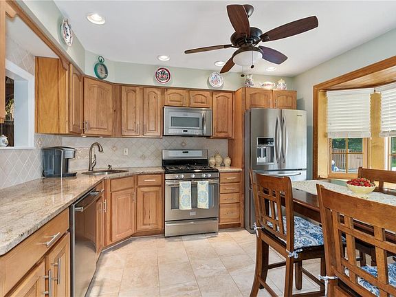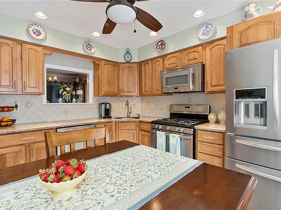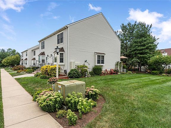 Beautifully updated and meticulously maintained 2BR end unit. Bright and sunny eat-in kitchen w/ bay window and pass through to dining room. Granite countertops, stainless steel appliances, tile floor Hardwood floors in dining room & living room w/ crown molding, recessed lighting and gas fireplace. Pella doors lead to extended deck to relax outside. Master bedroom with ceiling fan, crown molding and HUGE walk-in closet. Fully renovated full bathroom with quartz counter and tile floor. Additional bedroom w/ ceiling fan, double closets. New carpet throughout second floor (2021). Laundry hook up in basement which offers plenty of additional storage.