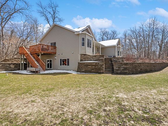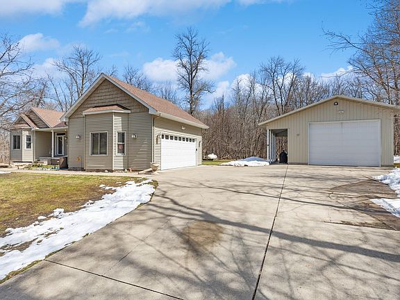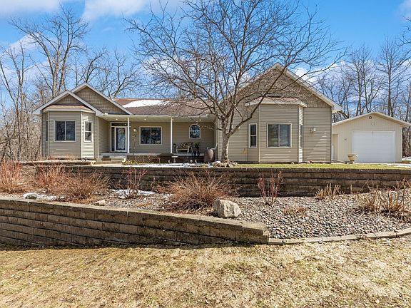 Walkout Rambler sitting on a private, 1.19-acre lot, one block from the Lake Ida public access. All your living facilities can be found on one level. The main floor open concept design features hardwood floors, two-sided stone fireplace, kitchen with breakfast bar, granite countertops, SS appliances, & maple cabinets, primary bedroom ensuite with separate shower and jetted tub & walk-in closet, 2nd bedroom, den (potential bedroom), 2nd full bath, four season porch, six panel solid core doors, & laundry area with sink. Beautifully landscaped with retaining walls and a wooded lot, enjoy wildlife throughout the year from the front porch, deck, or paver patio with fire pit. The lower level features a family room with stone fireplace, rec room, full bath, and additional bedroom. There is also room for your toys in the 32x24 steel building with an oversized garage door, concrete floor, & electric (100 amp panel). The steel building also features a 32x6 lean-to-overhang.