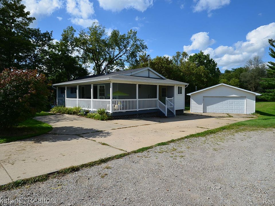 Ranch with wrap-around covered front porch in quaint Goodrich Village on 1 acre. Large 33X24 pole barn with cement floor, electricity, water, overhead door with opener. Home offers a great open floor plan with 3 bedrooms, 1.5 baths, living room, family room. Large eat in kitchen with adjacent 1st floor laundry. Enter side door into separate mud room. Living room with bay window and free-standing wood-burning stove. Family room with door wall to deck overlooking backyard. Walk out basement. A high-quality heating system, hot water heater, and well tank were all installed in 2020. Updates include; vinyl replacement windows, most interior paint, most laminate flooring, ceiling fans, light fixtures, and exterior doors. Oversized 2+ car detached garage (35X24) with workshop. Concrete driveway. Across the road from popular Goodrich Country Club with clubhouse restaurant/bar. In the Goodrich school district.