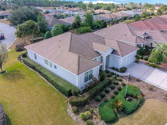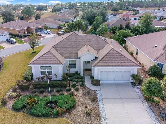 Beautiful Essex model home in Avalon has it all!! 3 bdrm. (one w/ French doors; use as a den), 2 bath, 2-car garage home in much sought after On Top of the World. Move in ready. Upgrades galore! Hardwood & tile flooring throughout (no carpet). Granite counter tops w/real wood cabinets. Dining nook off of kitchen. Task lighting under cabinets. Gas range. Pantry. Open living/dining area with tall ceiling feels open and welcoming. 2 ceiling fans in living areas w/ remotes. Inside laundry w/pocket door & plenty of cabinets for storage. Large master bedroom, master suite bath w/dual sinks, private lavatory, separate soaking tub & shower. His & Her WIC w/ mirrored doors. Florida room with tiled floor has screens, 2 ceiling fans & Sun-Kool pull down shades. Lanai is wired for 220 amp. Solar fan in attic. LOTS of storage cabinets in garage and peg board. Garage screen. A/C 2015. Washer is only a few months old, newer refrigerator. Hard wired surround sound. All rooms freshly painted with Sherwin Williams custom colors, soft, neutral. Ceiling fan/light remotes throughout. Light dimmers throughout. Crown molding throughout entire home with high ceilings. Beautiful landscaping on large corner lot with paved back patio and walkway. Short distance to Avalon Recreation Center. Drive golf cart to Walmart and Publix Shopping Center. This is one you don't want to miss!