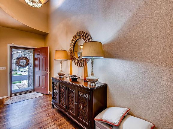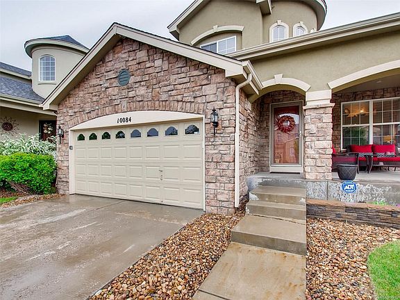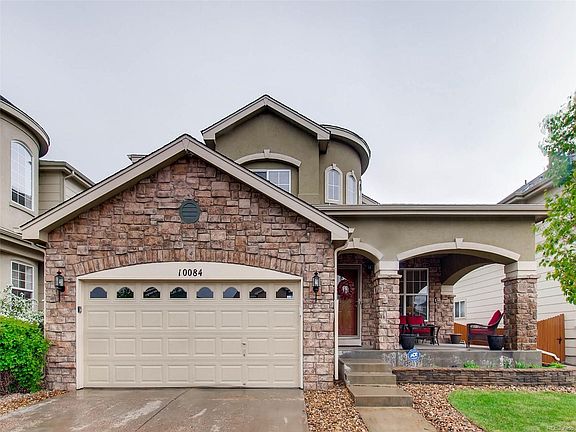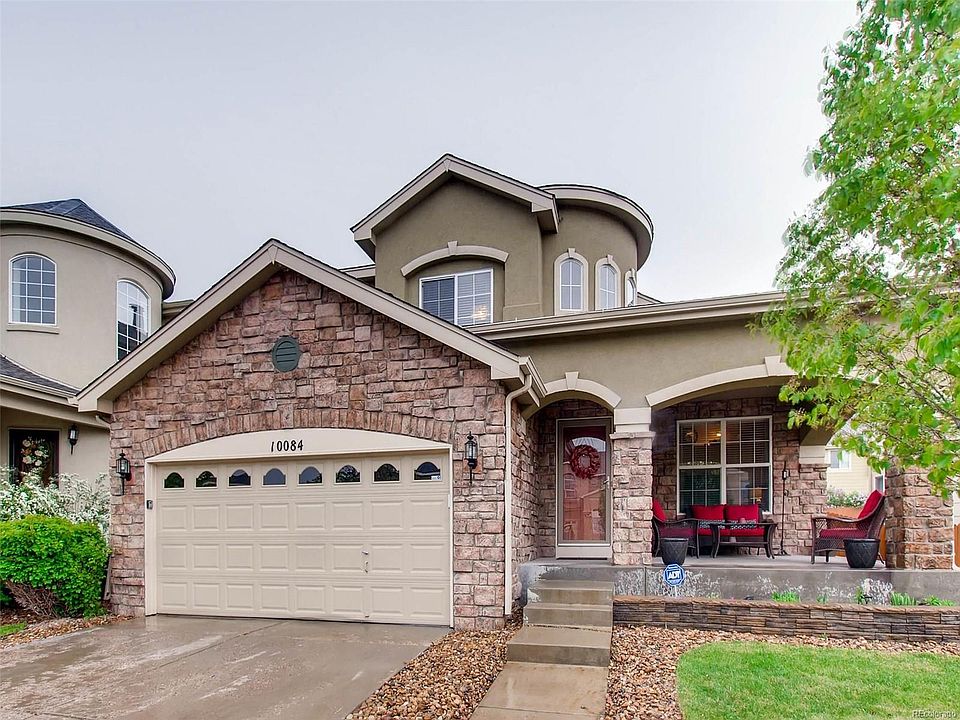 This Gorgeous home welcomes you with a dramatic two-story grand entry with a round turret. Features a sunny formal living room with vaulted ceilings. The family room is an open, great-room concept and sparkles with a wall full of windows, a gas fireplace with built-ins. Kitchen boasts stainless steel appliances, an abundance of cabinet and counter space, and sunny breakfast/dining nook! Retreat to the highly sought after main floor master suite with vaulted ceiling, 4pc bath and walk-in closet! Main floor laundry, powder room and large two car garage with additional space for a workbench or storage. 2 secondary bedrooms share a full bath on the upper level. Basement has a large rec room, 3 additional bedrooms with egress windows, storage space and a full bath! Private, fenced yard with large deck great for entertaining! Sprinkler system and gorgeous, low-maintenance landscaping in front and back. Great community with a pool and park and is close to I-76 and Hwy 85 for easy commute!